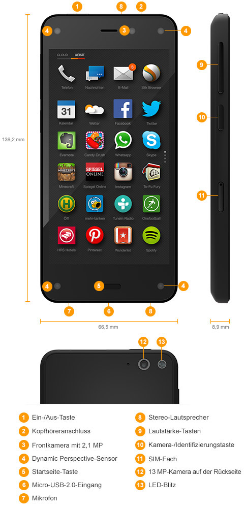 | | Betriebssystem | Fire OS 3.6 | | Speicherplatz | 32 GB oder 64 GB (tatsächlich formatierte Kapazität ist geringer) | | Speichern in der Cloud | Alle Amazon-Inhalte sowie mit dem Fire Phone aufgenommene Fotos werden kostenlos in der Cloud gespeichert | | Akku | Akkukapazität: 2400mAh. Sprechzeit: bis zu 17 Stunden; Standby-Zeit: bis zu 285 Stunden. Video-Wiedergabe: bis zu 11 Stunden; Audio-Wiedergabe: bis zu 65 Stunden. Die Akkulaufzeit variiert abhängig von der Signalstärke, der Netzwerkkonfiguration, den Geräte-Einstellungen, der Nutzung und anderen Faktoren. Die tatsächlichen Ergebnisse können abweichen. | | Video-Aufnahmen | HD-Video-Aufnahmen in 1080p bei 30 fps (front- und rückseitige Kamera) | | Audio-Wiedergabe | Stereo-Lautsprecher mit Dolby Digital Plus-Audioverarbeitung | | TV und Video | Displayduplizieren und Zweitbildschirm-Funktion wird unterstützt | | Unterstützte Inhaltsformate | Audio: Dolby Digital (AC-3), Dolby Digital Plus (E-AC-3), DRM-freie AAC, MP3, MIDI, OGG, PCM/WAVE, AAC LC/ELD, HE-AAC (v1 & v2), AMR-NB, AMR-WB, AMR-WB+, Audible Enhanced (AAX); Video: MPEG4, VP8, H.264/MPEG4/AVC, MPEG4 SP, H.263, AVI, HDCP2.x, PlayReady DRM; Bilder: JPG, GIF, PNG, BMP, GIF87a, GIF89a; Dokumente (Lesezugriff): PDF, ungeschützte MOBI, PRC nativ, DOC, DOCX, Kindle (AZW), KF8, TXT | | Sensoren | Dynamic Perspective-Sensor-System mit unsichtbarer Infrarot-Beleuchtung, Drehratensensor, Beschleunigungsmesser, Magnetometer, Barometer, Näherungsschalter, Umgebungslichtsensor | | Ortung | GPS, Assisted GPS (WLAN-/Mobilfunkortung), GLONASS und digitaler Kompass | | Mobilfunk | Pentaband-UMTS/HSPA (850, 900, 1700/2100, 1900, 2100 MHz), Duoband-DC-HDSPA (900, 2100 MHz), Quadband-GSM/EDGE (850, 900, 1800, 1900 MHz), 9 4G-LTE-Bänder (Bänder 1, 2, 3, 4, 5, 7, 8, 17, 20) | | Verbindung | WLAN 802.11a/b/g/n/ac, bis 300 Mbps mit Channel Bonding; Bluetooth 3.0; NFC-fähig | | Kopfhörer | Hochwertige Kopfhörer mit Fernbedienung und Mikrofon, ohne Kabelsalat | | Hörgeräte-Kompatibilität | M4, T4 | | SIM-Karte | Nano-SIM-Karte (nicht im Lieferumfang inbegriffen) | | Anschlüsse | Micro USB 2.0 3,5 mm-Kopfhöreranschluss | | Garantie und Service | Zweijährige beschränkte Herstellergarantie inklusive. Die Nutzung des Fire Phones unterliegt den hier aufgeführten Bedingungen. Die beschränkte Herstellergarantie besteht zusätzlich zu allen jeweils anwendbaren Gewährleistungsrechten für Verbrauchsgüter und beeinträchtigt diese in keiner Weise. Das bedeutet, dass Ihnen nach Ablauf der beschränkten Herstellergarantie immer noch gesetzliche Ansprüche zustehen können (weitere Informationen zu Ihren Verbraucherrechten finden Sie hier). | | Lieferumfang | Amazon Fire Phone mit Fire OS 3.6 Hochwertige Kopfhörer mit Fernbedienung und Mikrofon Micro-USB-zu-USB-Ladekabel USB-Netzteil (9W)