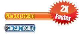 Der aktuelle PCI Express® 3.0- (PCIe 3.0) Busstandard bietet eine verbesserte Verschlüsselung für eine doppelt so hohe Leistung wie mit dem derzeitigen PCIe 2.0-Standard. Die komplette Bandbreite für eine 16-fache Geschwindigkeit erreicht maximal 32GB/s, d.h. das Doppelte der 16GB/s, die der PCIe 2.0-Standard (im x16-Modus) erreichen kann. PCIe 3.0 bietet dem Nutzer unvergleichlich hohe Datenübertragungsgeschwindigkeiten. Durch die Abwärtskompatibilität mit PCIe 1.0- und PCIe 2.0-Geräten kann der Übergang zudem nahtlos und besonders komfortabel erfolgen. Für Nutzer, die die Grafikleistung verbessern und optimieren und mit der aktuellsten, zukunftssicheren Technologie ausgestattet sein wollen, ist dieses Feature unverzichtbar.