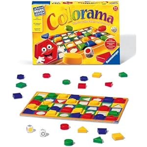 Colorama ist ein tolles Spiel zum Erlernen von Formen und Farben. Es gibt einen Farb- und einen Formenwürfel, mit welchen ermittelt wird, welchen Spielstein man auf das Spielbrett legen darf. Es gibt 5 verschiedene Formen und jede Form in vier unterschiedlichen Farben. Beide Würfel haben weiters noch einen Joker sowie der Farbwürfel eine weiße Fläche, wo man aussetzen muss.