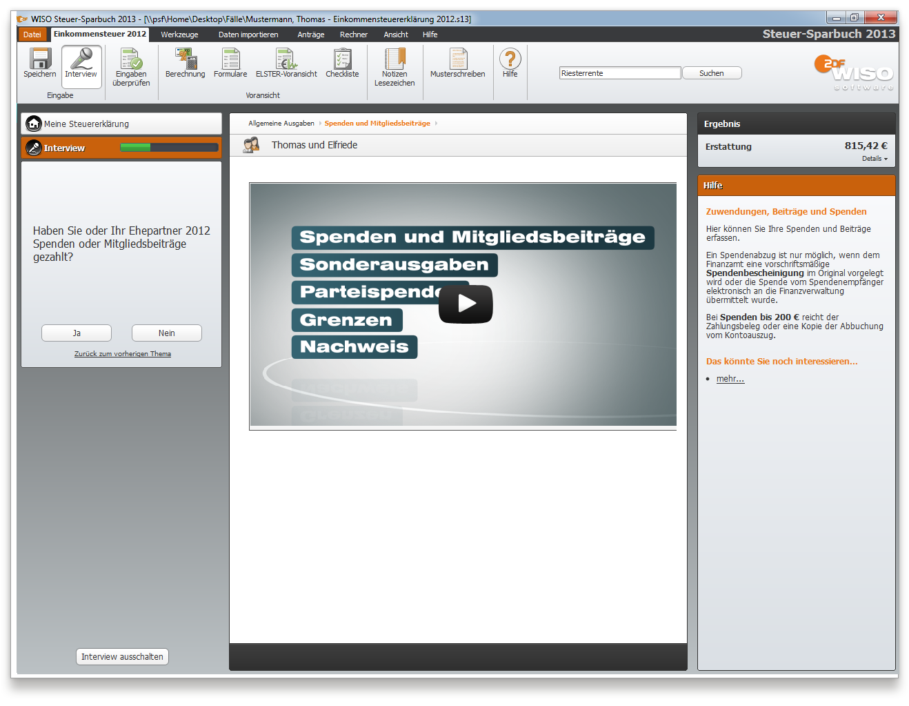 Lassen Sie sich Schritt für Schritt im Interview durch die Steuererklärung führen. Ein Klick genügt und das aktuelle Thema wird in einem kurzen, leicht verständlichen Film erklärt. So wird die Steuererklärung WISO-einfach!