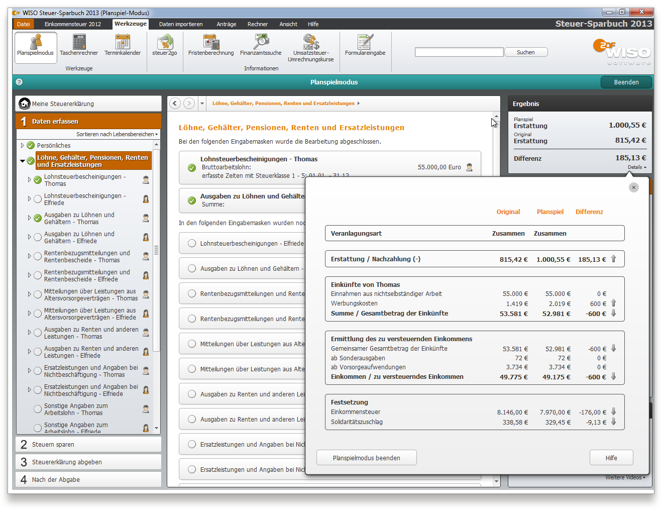 Mit dem WISO Steuer-Sparbuch 2013 erledigen Sie Ihre Steuererklärung für 2012 ganz einfach selbst am PC. Die ideale Lösung für Angestellte, Arbeiter, Beamte, Rentner, Pensionäre, Anleger, Vermieter und Selbständige.