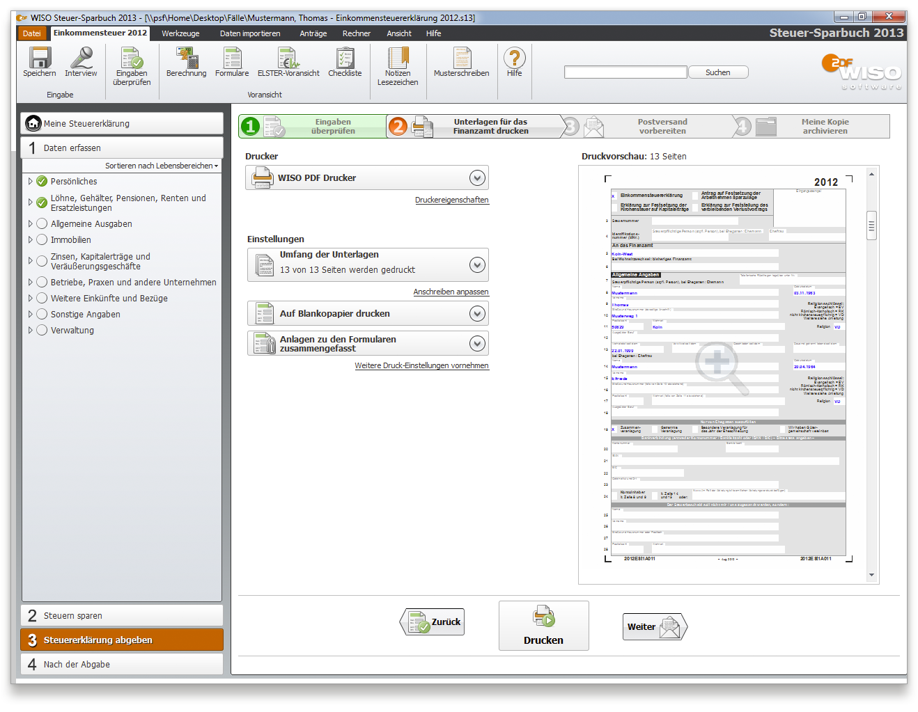 Mit dem WISO Steuer-Sparbuch versenden Sie Ihre Steuererklärung entweder per ELSTER online oder ganz klassisch auf Papier an das Finanzamt. Der Abgabe-Assistent hilft Ihnen, nichts zu vergessen und stellt alle notwendigen Unterlagen automatisch für Sie zusammen.