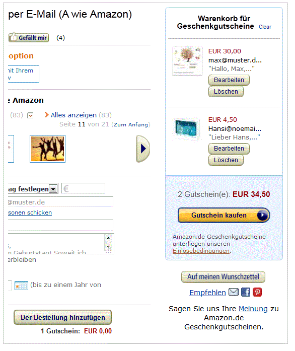 Wann erhalte ich meinen Gutschein?Gutscheine zum Ausdrucken: Sie können den Gutschein über die entsprechende Funktion bei der Bestellübersicht unter "Mein Konto" ausdrucken. Es wird Ihnen der Schaltknopf Gutschein(e) drucken angezeigt, sobald der Gutschein erstellt wurde. Gutscheine zum Ausdrucken sind verfügbar, kurz nachdem Ihre Bestellung abgeschlossen ist. Nur in einigen Ausnahmefällen kann es bis zu 15 Minuten dauern, bis Ihr Geschenkgutschein für den Druck verfügbar ist. Geschenkkarten: Die Zustellung per Post erfolgt innerhalb Deutschlands am nächsten Werktag. Für eine Zustellung nach Österreich rechnen wir mit 3-4 Werktagen. Bitte haben Sie Verständnis dafür, dass dies nur ungefähre Angaben sind und Amazon keine Haftung für eventuelle Verzögerungen oder technische Schwierigkeiten bei der Übermittlung übernimmt. Wie lange sind Geschenkgutscheine gültig?Alle Gutscheine sind bis zum Ende des dritten Jahres nach Kauf einlösbar. Das genaue Ablaufdatum wird immer direkt auf dem Gutschein angegeben. Wie drucke ich einen Gutschein zu Hause aus?Wenn Sie die Gutscheinoption "Gutschein zum Ausdrucken" auswählen, erstellen wir einen Gutschein im PDF-Format für Sie. Den Gutschein können Sie über "Mein Konto" in der Bestellübersicht einsehen und ausdrucken. Der Adobe Acrobat Reader muss auf Ihrem Computer installiert sein, damit Sie die PDF-Datei öffnen und drucken können. Die Zahlung ist per Kreditkarte und Bankeinzug möglich.