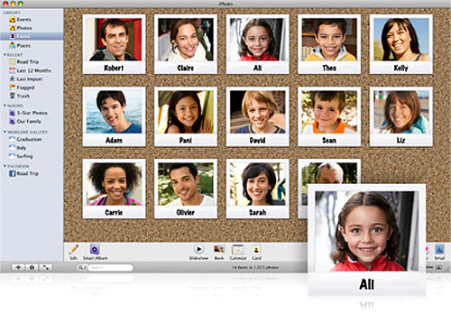 Mit iPhoto 09 gibt es erstmals die Funktion "Gesichter", die automatisch Gesichter in Ihren Fotos erkennt und sogar wiedererkennt. iPhoto durchsucht zunächst Ihre Mediathek, um Fotos von Personen zu finden. Dann sucht es nach Gesichtern, die zu einer Person gehören könnten. So wird es einfach, Ihre Fotos zu benennen und schnell Personen zu finden, nach denen Sie suchen.