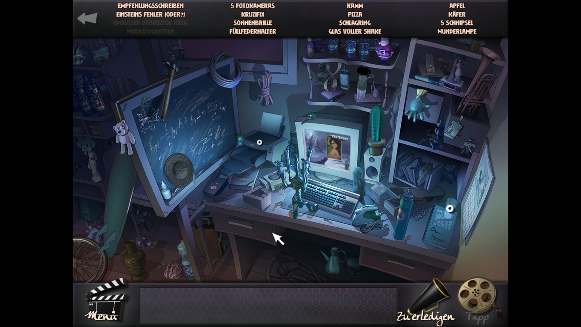 Brians Schlafzimmer dient nun als Hub-Screen von dem aus wir die anderen Screens erreichen - einmal seinen Schreibtisch und dann noch das Nebenzimmer. Diese beiden sind klassische Wimmelbilder und das Spiel überlässt es uns, mit welchem wir beginnen möchten. Auf dem Schreibtisch erwimmeln wir nun allerlei Dinge und zur Belohung gibts einen der benötigten Gegenstände für den Koffer. Dann steht auf dem Schreibtisch allerdings noch ein Drucker dessen Patrone leer ist. Also suchen wir im Hub-Scren nach einer Patrone. Ganz nebenbei entdecken wir im Mülleimer noch Schnipsel für den Bücherzettel. Mit der Patrone im Inventar gehts zurück zum Schreibtisch und wir kombinieren diese mit dem Drucker und drucken uns so unser Empfehlungsschreiben aus. Wie gesagt das Wort "Rätsel" sollte man bewusst in Anführungszeichen setzen. Dennoch lockern sie die starren Grundmuster eines Wimmelbildspiels angenehm auf. Nachdem wir dann noch auf dem Schreibtisch einige weitere Schnipsel für den Bücherzettel erwimmelt haben, legen wir all die kleinen Fetzen auf eine kleine Kommode und puzzeln sie in einem kleinen Minispiel (wie man es aus viele anderen Adventures schon kennt -z.B. Black Mirror) zu einem intakten Schein zusammen.