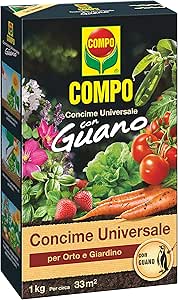 Universeller Compo Dünger mit biologischem Guanodünger 7-5 mit mittlerer Dosatoredosis Schaufel: 30 g/m2 - 10 g/20 lconcima Topf mit natürlichen Komponenten. Bereichert den Boden mit natürlichen Substanzen, die leicht zu assimilieren und im Laufe der Zeit haltbar sind. Dank compo guano wird das Gemüse und Obst zahlreicher sein, mit unvergleichlichem Geschmack, Farbe und Aroma, und die Blüten werden prächtig sein.