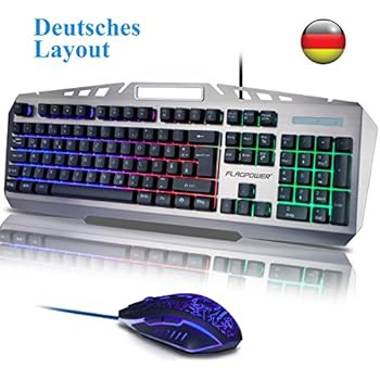Gaming Tastatur und Maus Set, FLAGPOWER USB Beleuchtete Gaming Tastatur mit Maus Wasserdicht Multimedia LED Hintergrundbeleuchtung PC Tastatur 6 Farben Beleuchtung (QWERTZ, Deutsches Layout)
