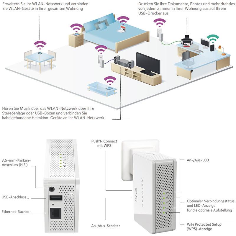 Die universelle NETGEAR Dual-Band-Reichweiten-Erweiterung als Wandmontage-Edition vergrößertdie WLAN-Abdeckung eines vorhandenen WLAN-Netzwerks überall in Ihrer Wohnung, so dass Sie Ihre WLAN-Geräte an mehr Orten benutzen können – von der Terrasse bis zum Hinterhof. Die Reichweiten-Verstärkung unterstützt gleichzeitig die WLAN-Abdeckung in beiden Frequenzbereichen,so dass Sie sowohl 2,4-GHz- als auch 5-GHz-Geräte nutzen können. Das Gerät verbessert nicht nur die WLAN-Abdeckung, sondern gestattet auch die drahtlose Übertragung von Musik übers Netzwerk bis zu jeder Anlage oder Lautsprecher in Ihrer Wohnung. Und wenn Sie einen Drucker an den USB-Port der Reichweiten-Erweiterung anschließen, machen Sie jeden USB-Drucker drahtlos erreichbar für jedes WLAN-Gerät in jedem Zimmer Ihrer Wohnung.
