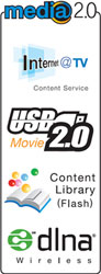 | Internet@TV: Nützliche Internet Informationen: (z. B. YouTube, Flickr, Yahoo Services) SB 2.0 Movie: über USB 2.0 | Content Library: Vorinstallierte nützliche Inhalte: Wireless DLNA: Zugang zum PC über kabelloses Netzwerk Ihren Fernsehschirm | |