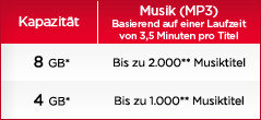 - Platz für bis zu 2.000 Musiktitel, mit 8 GB integriertem Speicher