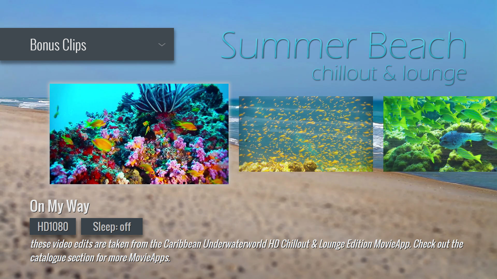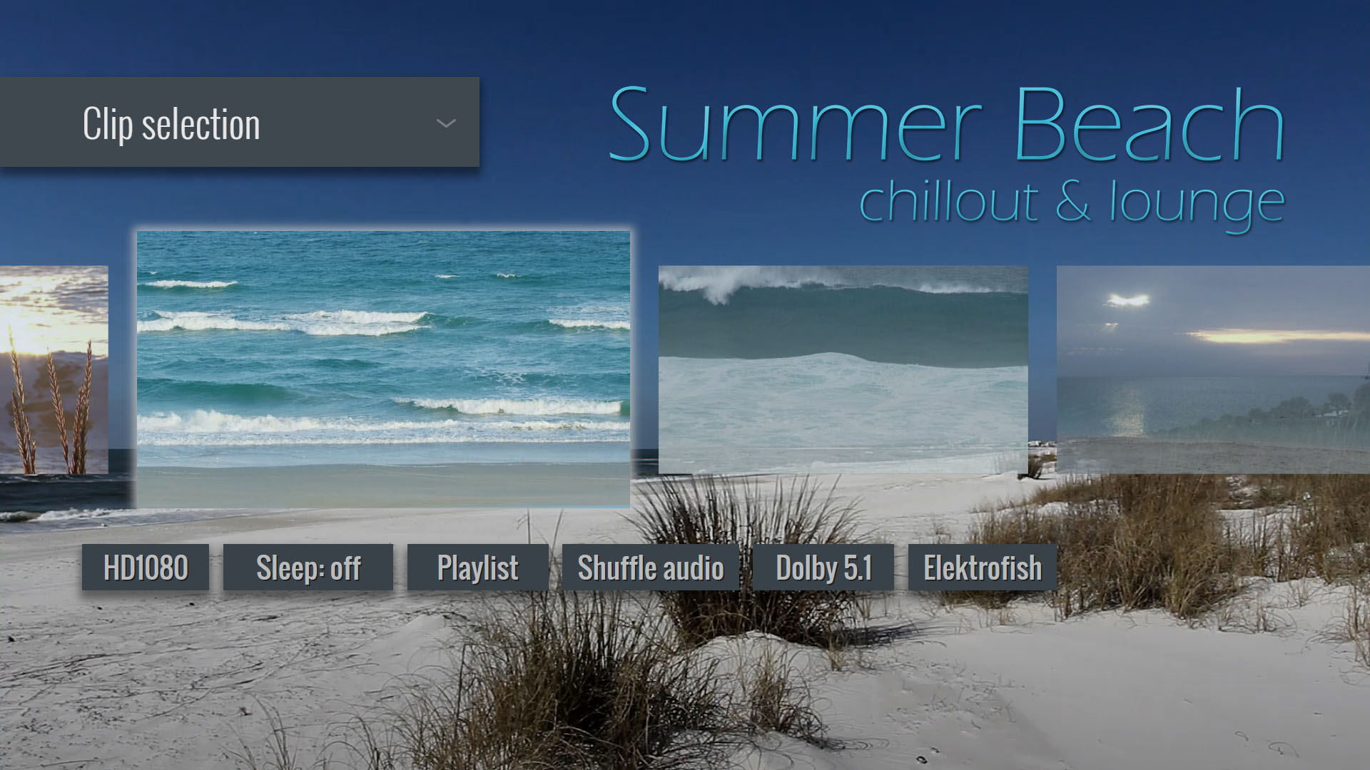 Geniessen Sie wunderwolle Strände und die entspannenden Wellen des Meeres mit der Musik der Projekte NMS Music oder ELEKTROFISH. Alternativ kann auch ein Strand-Wellen-Sound im Dolby Digital 5.1 Format abgespielt werden. Als speziellen Bonustrack bietet dieses MovieApp einen 5.1 Mix des Musiktitels "Firewall" des Projekts Science O.C.N. Videos und Musik können im Zufallsmodus unabhängig voneinander abgespielt werden, sodass sich bei jedem Abspielvorgang ein völlig neues audiovisuelles Erlebnis ergibt.