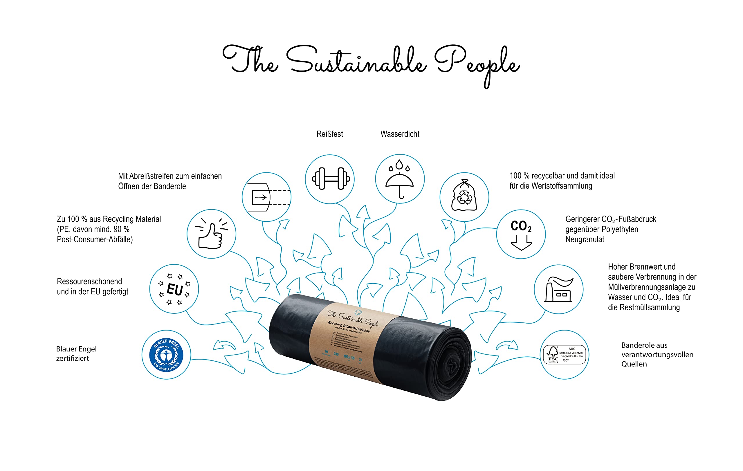 • BLAUER ENGEL: TSP Recycling Müllsäcke bestehen zu mind. 90 % aus post-consumer Recycling-Kunststoffen, sind schadstoffbegrenzt und erfüllen damit die Anforderungen des Umweltzeichens "Blauer Engel" gemäß uz30a
