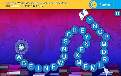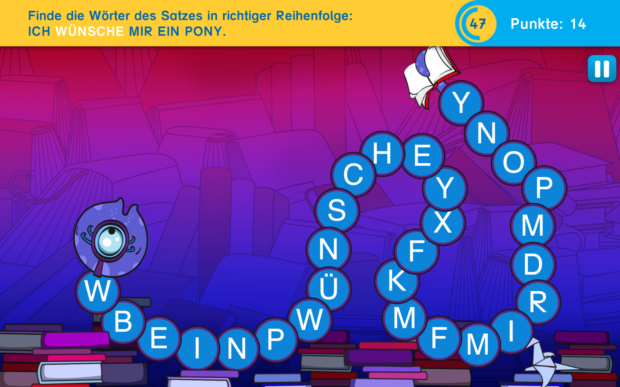 Bücherwurm In einem Kontinuum von sich bewegenden Konsonanten sollen möglichst schnell die gesuchten Wörter erlesen werden. Diese Übung trainiert die Erfassung von Wortgrenzen.