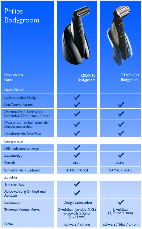 | Dank der antiallergischen Scherfolie lässt er sich auch für die sensiblen männlichen Körperpartien einsetzen. Kleine Verletzungen, Schnitte und Hautirritationen, wie sie bei anderen Haarentfernungsmethoden vorkommen können, gehören damit der Vergangenheit an. Statt dessen sorgt der Bodygroom für eine hautschonende und unkomplizierte Haarentfernung vom Hals bis zu den Zehen.