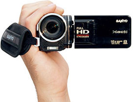 Die Xacti Dual Kamera VPC-FH1 von SANYO zeichnet sich durch ihr kleines und leichtes Format aus. Trotz des äußerst kompakten Gehäuses unterstützt die FH1 die Full HD-Auflösung (1.920 x 1.080 Pixel, 60fps) und erfüllt damit höchste Ansprüche an die Bildqualität. Zudem lassen sich mit der FH1 detailreiche Fotos in einer Auflösung von acht Megapixel aufnehmen.
