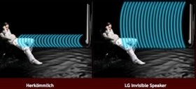 | Klarer Sound Unsichtbare Lautsprecher - Das einzigartige Invisible Speaker System von LG sorgt für ein elegantes Design und verbesserte Audio-Wiedergabe. Im Gegensatz zu herkömmlichen TV-Geräten sind die Lautsprecher der LG LCD Fernseher im Frontrahmen der Geräte integriert. Resonatoren an strategisch berechneten Punkten hinter dem TV-Rahmen regen diesen dazu an, Schall zu erzeugen. So verwandelt sich der Rahmen des TV-Gerätes in einen unsichtbaren Lautsprecher. Der auf diese Weise erzeugte akustische "Sweet Spot" sorgt dafür, dass Sie Ihr TV-Ereignis in einem vollen und satten Klangfeld mit allen Sinnen genießen können. | ![]() |