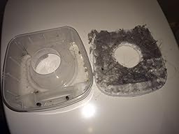 Zwischen durch zeigt er an, das die Auffangschale im inneren gelehrt werden muß (rotes Licht in der Mitte leuchtet) und dann geht's weiter. Das leeren ist einfach, da sich der kleine leicht transparente Einsatz über einen Henkel entnehmen läßt, den Filter heraus nehmen und den Inhalt in den Mülleimer. Dauert keine Minute (1 Ersatzfilter wird ebenfalls mitgeliefert).